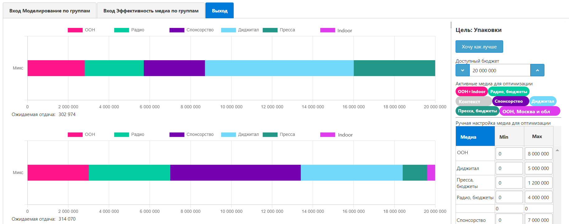 Интерактивный оптимизатор для поиска оптимального соотношения медиа для максимальных продаж